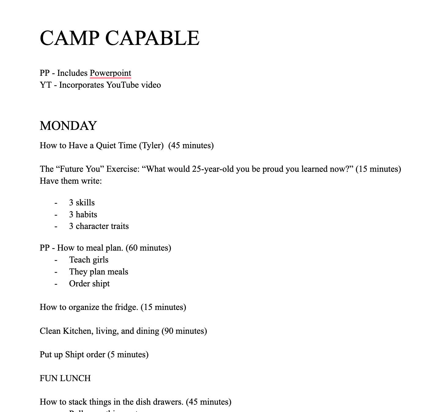 Not everything you plan will fit. If you’re overly ambitious like I am, it might be half. ;) At the end of the day, I’d reevaluate what we actually did and move things around for the next day if needed. I also kept a list of things we didn’t finish by the end of the week that we can slowly add to our weeks. Just because Camp Capable is over, doesn’t mean we can’t keep learning these things.